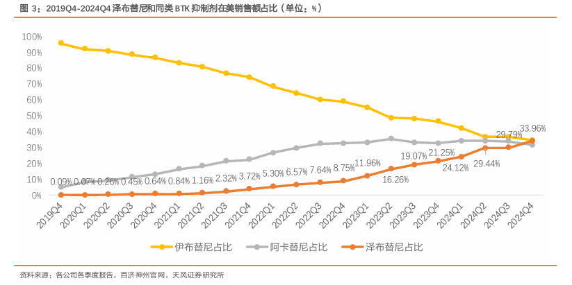 泽布替尼在美市占率持续提升,几乎和伊布替尼并列第一。2024Q4泽布替尼在美国的销售额占其和同类BTK 抑制剂伊布替尼、阿卡替尼在美国销售总额的33.96%左右,和伊布替尼的34.45%几乎持平。从 2024Q1 到 2024Q4,泽布替尼在 BTK 抑制剂中的市场占比提升约10 pct,迅速实现市场扩张。