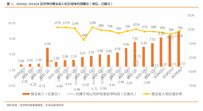 2024Q4 和2024年全年,百济神州营业收入分别为11.28亿和38.10亿美元,同比增长78%和55%,收入持续增长;归母净亏损分别为-1.52亿和-6.45亿美元,亏损收窄。