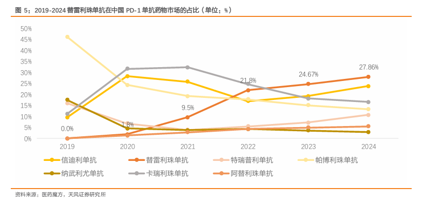 替雷利珠单抗在竞争激烈的PD-1单抗赛道快速实现市场渗透。根据样本医院销售数据显示,2024 年,替雷利珠单抗占据了主要PD-1单抗药物市场的约28%的市场份额。