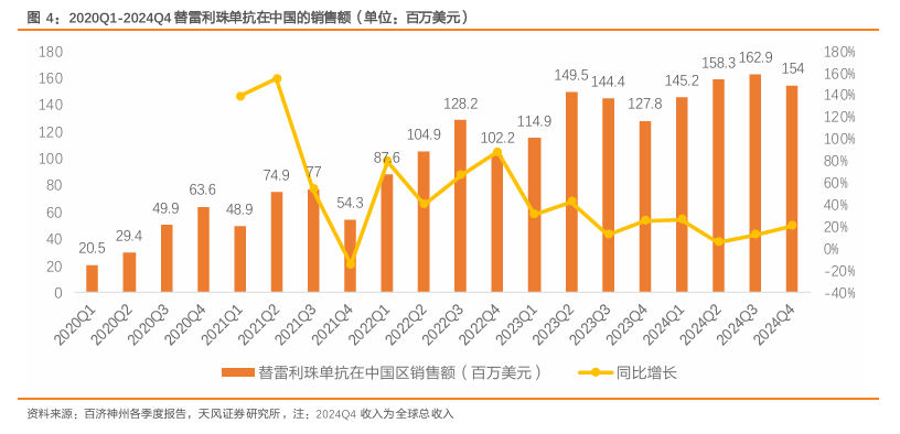 2024Q4 和2024年替雷利珠单抗总收入分别为1.54亿和6.21亿美元,同比增长20%和16%。