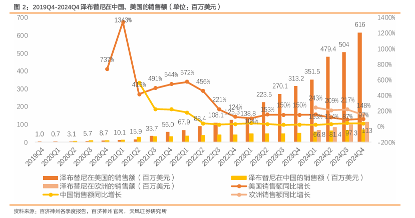 2024全年核心品种泽布替尼同比增长超100%,美国保持环比快速增长