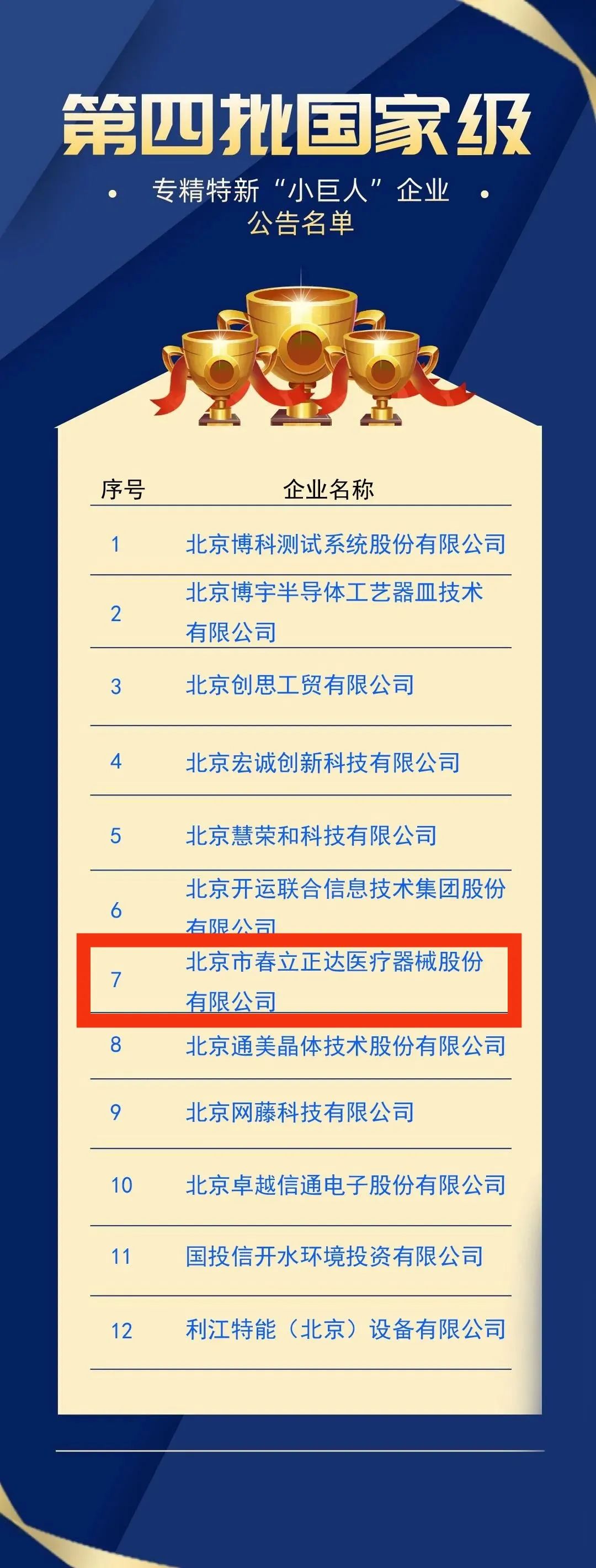 2022年北京市经济和信息化局公告第四批国家级专精特新“小巨人”企业,春立医疗光荣上榜。此次被评选为国家级专精特新“小巨人”企业,充分展现了企业的创造能力与创新水平,也体现了国家对春立医疗产品创新与公司在社会上正面影响的高度认可。