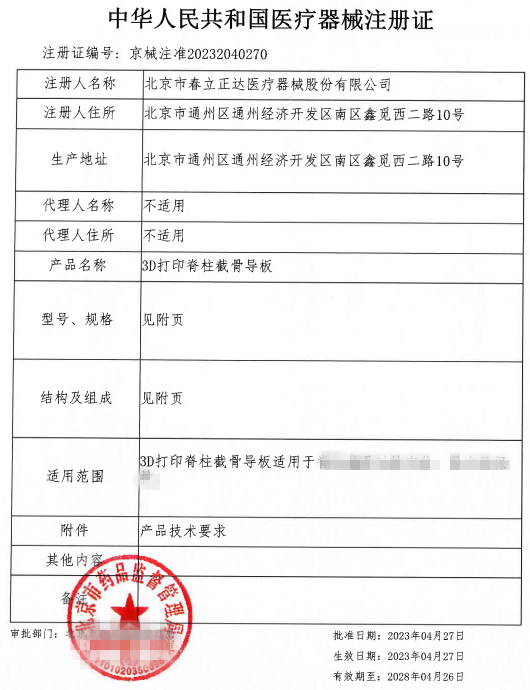 本产品使用生物相容性良好的PA12材料,利用增材制造加工而成,可以与患者骨组织的解剖形态高度贴合,能够准确提供定好和导向作用,可以大大减少脊柱手术中的时间,有助于提高手术成功率。