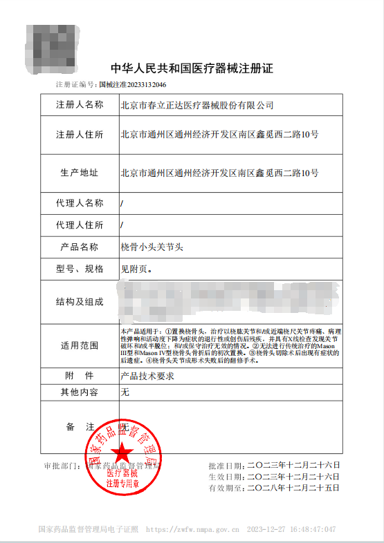 适应症:用于肘关节桡骨小头关节置换,作为非水泥型桡骨头假体使用,适用于半关节置换。
