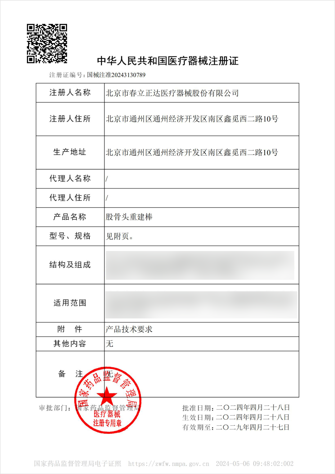 2024年4月,北京市春立正达医疗器械股份有限公司的“股骨头重建棒”经国家药品监督管理局批准注册。