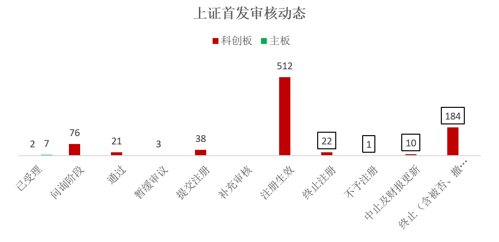 上交所信息显示,截止2月22日下午4时,上交所累计受理了876家企业的首发申请,其中科创板累计受理869家、主板累计受理7家。从审核状态来看,处于受理阶段9家,问询阶段的有76家,21家近期通过上市委会议。过会企业中,38家提交注册中,512家注册生效,22家终止注册,1家不予注册,另有10家中止审核,184家终止(含被否、撤材料)。