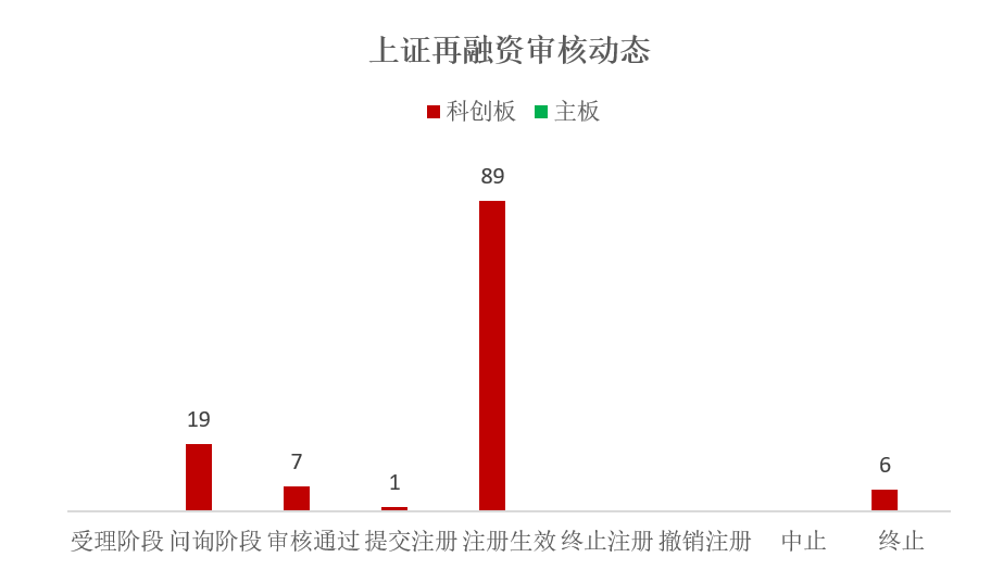 再融资方面,科创板目前处于问询阶段的有19家,审核通过7家,提交注册1家,注册生效89家,终止6家,主板暂无数据,上证板块再融资累计受理122家。