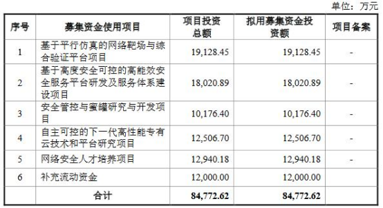 永信至诚本次发行募集资金总额为57,590.80万元,扣除发行费用后,募集资金净额为50,605.37万元(如有尾数差异,为四舍五入所致)。永信至诚最终募集资金净额比原计划少34167.25万元。2022年10月14日,永信至诚发布的招股书显示,公司拟募集资金84,772.62万元,分别用于基于平行仿真的网络靶场与综合验证平台项目、基于高度安全可控的高能效安全服务平台研发及服务体系建设项目、安全管控与蜜罐研究与开发项目、自主可控的下一代高性能专有云技术和平台研究项目、网络安全人才培养项目、补充流动资金。