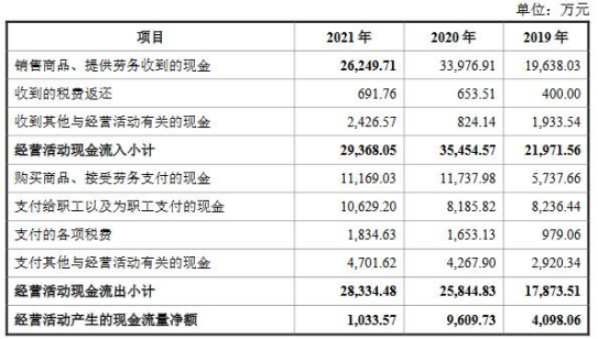 2019年至2021年,永信至诚销售商品、提供劳务收到的现金分别为19,638.03万元、33,976.91万元、26,249.71万元,经营活动产生的现金流量净额分别为4,098.06万元、9,609.73万元、1,033.57万元。