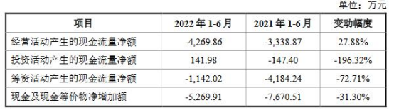 公司经营活动产生的现金流量净额为-4,269.86万元,较2021年1-6月净流出增加27.88%,主要是销售商品、提供劳务收到的现金减少1,466.20万元导致。