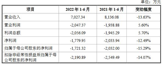 2022年1-6月公司营业收入为7,027.34万元,同比减少13.63%,净利润为-1,779.95万元,同比减少12.49%,归属于母公司股东的净利润为-1,721.32万元,同比减少15.29%,扣除非经常性损益后归属于母公司股东的净利润为-2,190.89万元,同比减少14.07%。