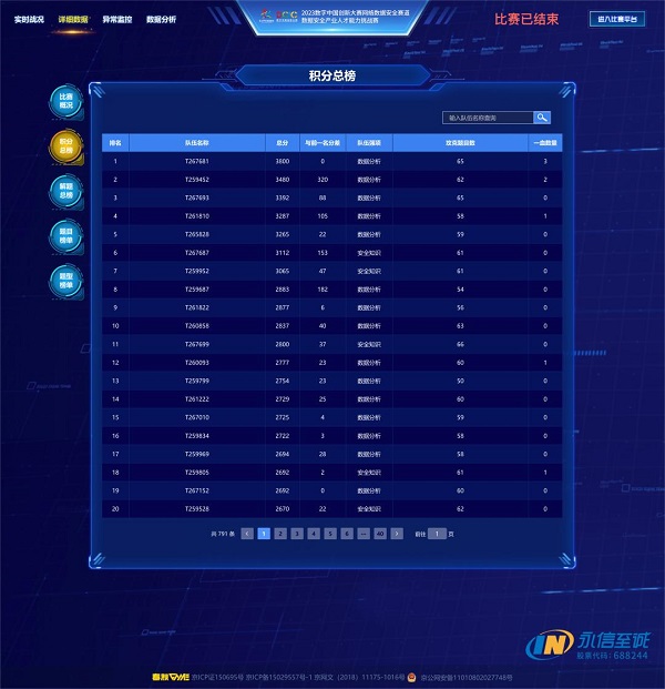 自大赛启动以来,吸引全国各行业部门、科研机构、关键信息基础设施单位、信息安全企业、互联网企业和高等院校等的1362支队伍、2761人报名参赛。作为大赛协办单位,永信至诚紧贴大赛需求和行业市场热点,依托数据安全“数字风洞”,围绕数据安全、数据分析、数据算法三大维度设置挑战区,结合真实的数据安全场景,打造全场景、全要素、全生命周期测试评估演练场,对选手的基础知识以及实际业务中综合运用能力进行考察,为网络和数据安全防护能力提升及安全测试评估营造更开放、更鲜活的氛围。