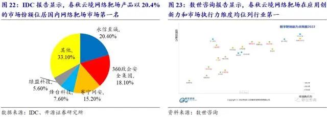 春秋云境网络靶场产品在国内网络靶场市场排名第一。据IDC研究报告显示,公司凭借春秋云境网络靶场产品以20.4%的市场份额位居第一名。数世咨询发布《数字靶场能力点阵图,2022》显示,春秋云境网络靶场在应用创新力和市场执行力维度均位列行业第一。