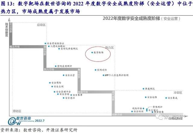 数字靶场在数世咨询数字安全能力图谱2022中位于安全运营下的安全演练分类中;在数世咨询的2022年度数字安全成熟度阶梯(安全运营)中位于热力区,市场成熟度属于发展市场,技术维度属于融合创新阶段。