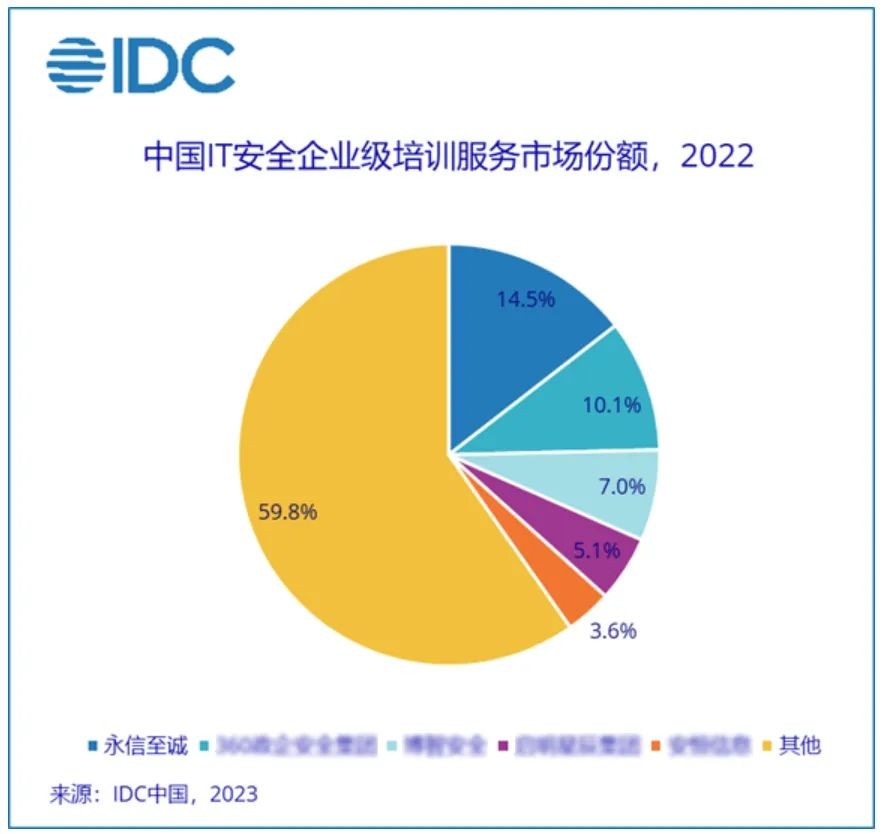 6月27日,国际权威咨询机构IDC最新发布《2022下半年中国IT安全服务市场跟踪报告》。报告显示,2022全年中国IT安全服务市场规模达到30.7亿美元,较2021年上升7.2%。其中,IDC定义IT安全企业级培训服务市场包括网络安全实训演练测试平台与服务、大型安全赛事、安全技能培训、安全意识培训,永信至诚凭借14.5%的市场份额,位居该细分领域第一名。这也是永信至诚连续六年领跑IT安全企业级培训服务市场,再次夯实网络靶场及人才建设领军地位。
