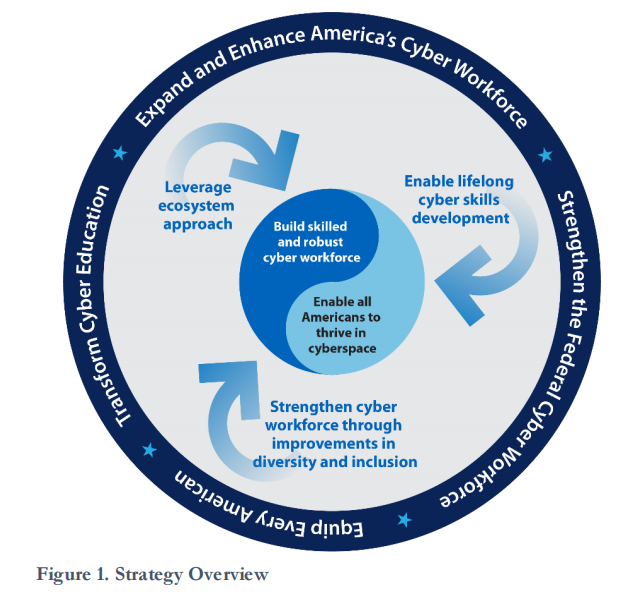 “没有一个个人利益相关者能够大规模地解决日益增长的网络人才需求。教育、劳工和商业利益相关者之间的积极合作是成功的关键。”此次《战略》由美国国家网络总监牵头制定,获得了34个机构、部门和EOP部门支持。《战略》呼吁号召教育机构、政府、学术界、企业组织、网络协会社区等各界之间的合作,建立网络教育和人才培训生态,以弥合教育与就业之间的差距。