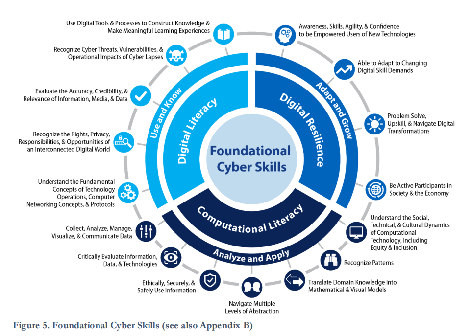 基础的网络技能包括数字素养、计算素养和数字韧性。《战略》强调,基础性的网络技能必须像阅读和数学一样普及。我们必须扩大提供基础网络技能的项目,为所有人提供基础的网络技能学习机会。鼓励行业专家、教育工作者、学院和大学、社区组织和相关的专业协会创建用于基础网络技能教学的内容,组织网络安全意识月、网络安全职业周、数字公民周、互联网安全周等扩大相关活动,以开放的知识网络,鼓励更多人积极主动地学习基础网络技能,并积极投身于网络领域的职业发展。