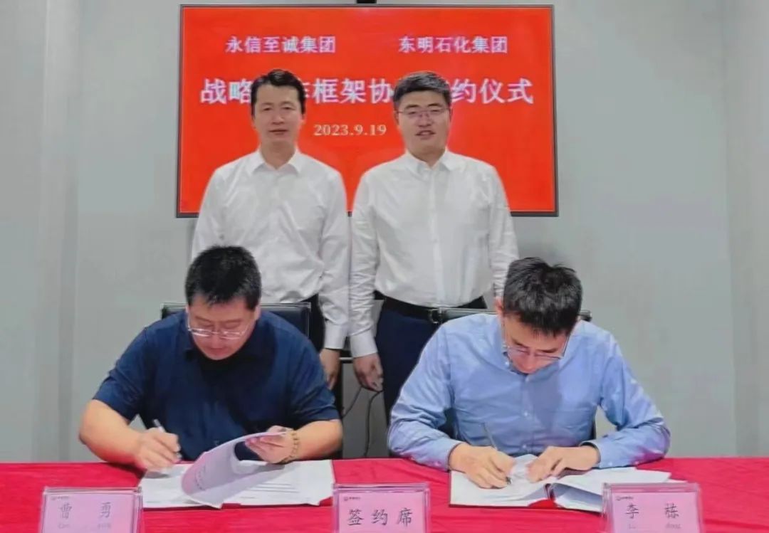 在东明石化总裁李治、永信至诚董事长蔡晶晶的共同见证下,东明石化全资子公司北京好雅副总经理李栋和永信至诚行业副总经理曹勇代表双方签署战略合作协议。
