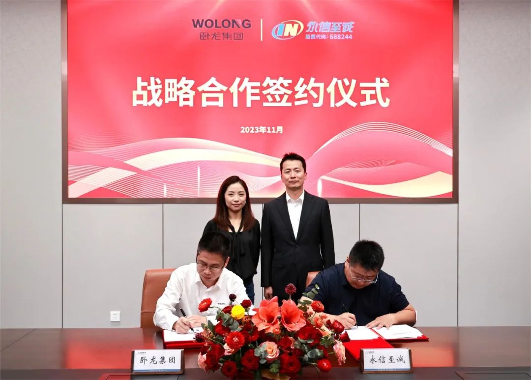 在卧龙控股集团董事长陈嫣妮、永信至诚董事长蔡晶晶的共同见证下,卧龙电驱副总裁张文刚、永信至诚副总裁曹勇代表双方签署战略合作协议。