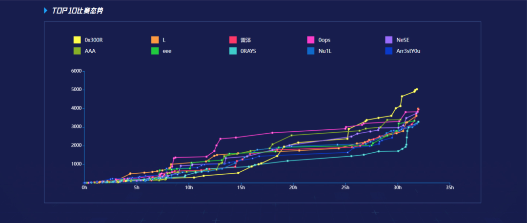 随着赛事热潮在各战队间轮番上演,本次线上赛也进入了倒计时阶段,各大团队都展现出强悍的战斗力,不断将赛事推向白热化。最终,0x300R战队突出重围,积分位列线上赛桂冠,L战队和雷泽战队位列积分榜第二、三名。本次比赛共收到flag提交33098次,第一名历经150次更迭,赛题攻克率95.7%。