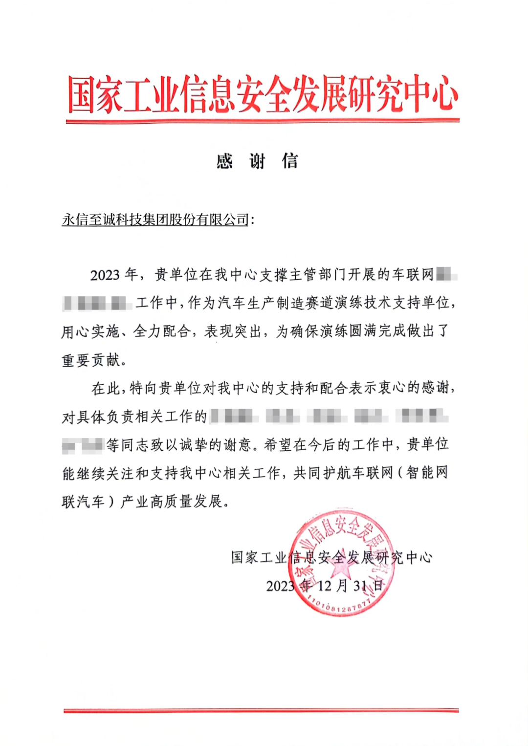 作为工业和信息化部直属事业单位,国家工业信息安全发展研究中心是支撑我国工业领域信息安全的国家级研究与推进机构。此次获得感谢信,不仅意味着行业对永信至诚“数字风洞”在测试评估领域独特优势的充分肯定,更是对永信至诚深耕车联网安全赛道实践成果的高度认可。