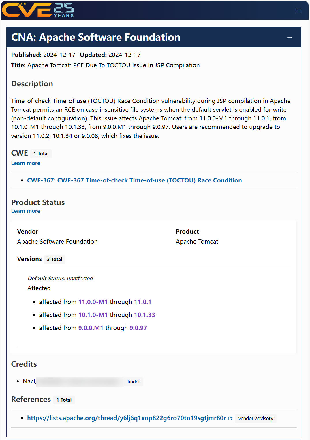 2024年12月17日,Apache Tomcat 官方发布安全通告,修复了一个存在于Apache Tomcat 开源组件中的远程代码执行漏洞(CVE-2024-50379)。作为该开源社区参与者,永信至诚春秋GAME团队霄壤实验室研究员因在Apache Tomcat 多个版本的漏洞验证、测试及修复方案工作中做出重要贡献,获得官方致谢。