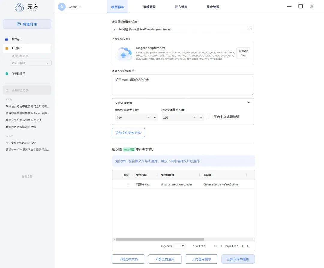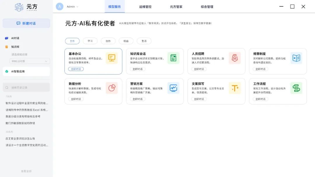 「元方」操作界面简洁直观,管理功能均可在3次点击内完成,真正实现“零基础”无障碍使用。用户可在5秒内创建专属知识库,结合身份认证形成管理、审计、使用三权分立,并实现权限隔离、数据隔离,支持对话集的单独留存与删除,避免数据泄露。