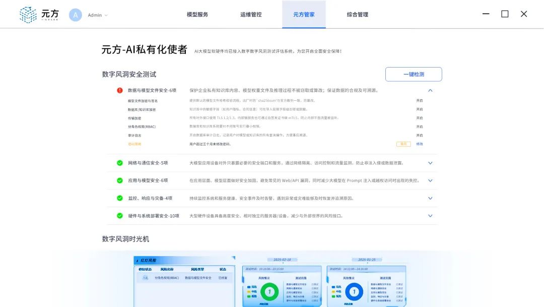 全栈铭刻安全基因:基于「数字风洞」产品体系,「元方」已完成从硬件到系统再到应用的全维安全测试,涵盖代码安全、主机安全基线、基础设备安全和数据安全等多个维度,为企业私有化AI系统铭刻安全基因;