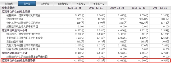 据东方财富数据,2017年至2021年,嘉和美康经营活动产生的现金流量净额分别为-4527万、-1.24亿、-1.64亿、-6024万、-1.975亿,连负五年。