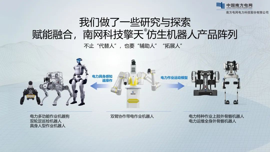 该报告发布了南网科技公司研发的第2代电力多功能作业机器狗,地形适应能力提升明显,整机上装自主可配置,可适应巡视、作业等应用需求;双轮足巡检机器人,兼具轮式、足式的优势,可适应日常巡视等应用需求;人型作业机器人,实现对室内外变电设备的巡视;电力特种作业外骨骼机器人,减轻工作强度,提升作业效率。现场演示了南网科技公司多款仿生机器人在广东电网公司韶关220kV樱花变电站的测试视频。