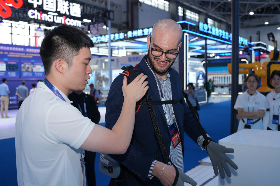 在本次数博会上,南网科技公司自主研发的“擎天”电力作业上肢外骨骼机器人和电力作业腰部外骨骼机器人一经亮相,就受到了广泛关注,吸引了众多观众参与体验。两款创新产品聚焦电网运维、应急抢修等核心场景,为电力工作人员提供了强有力的辅助支撑。