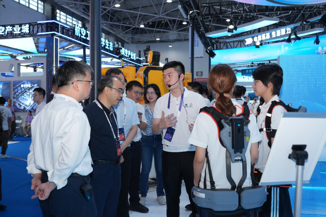 ▲南网科技公司工程师向南方电网公司副总经理吴小辰介绍“擎天”电力作业外骨骼机器人