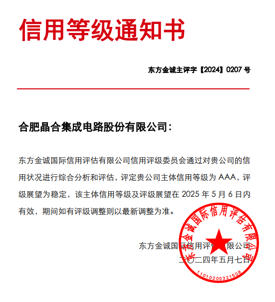 近期,经国内权威信用评级机构东方金诚国际信用评估有限公司首次主体信用等级评估,晶合集成获“AAA”主体信用等级认定,评级展望为“稳定”,成为安徽省首个主体信用等级为AAA的集成电路企业。