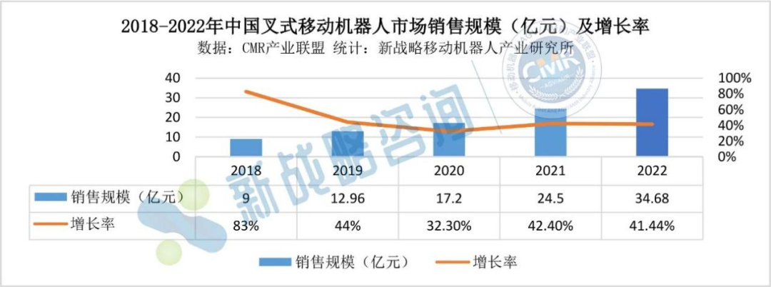 图表:2018-2022年中国叉式移动机器人市场销售规模(亿元)及增长率
