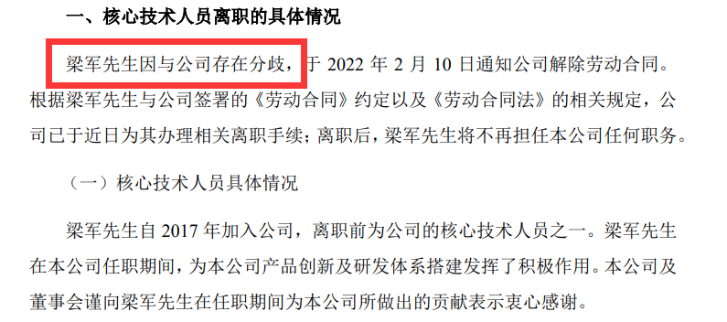3月15日,寒武纪公告披露,梁军作为寒武纪核心技术人员之一,因与该公司存在分歧,于2022年2月10日提出解除劳动合同。寒武纪已于近日为梁军办理离职手续,之后梁军不再在寒武纪任职。