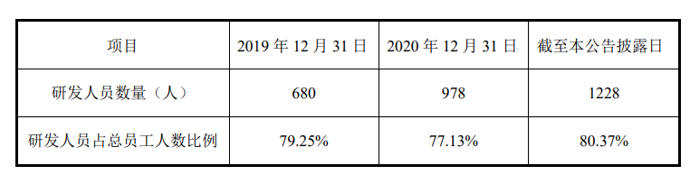 保持高强度研发,一直是寒武纪对巨额亏损的解释。2017年-2020年,寒武纪研发费用分别为0.30亿元、2.4亿元、5.4亿元和7.68亿元,营收占比分别为380.73%、205.18%、122.32%和167.41%。截至今年3月15日,该公司共拥有研发人员1228名,占总人数比例为80.37%。