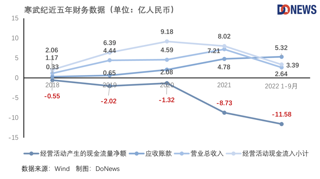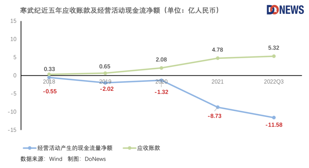 大致来说,经营活动产生的现金流净额=营业总收入-成本-应收帐款增加+政府补贴。近两年,政府给到寒武纪的补贴越来越少,寒武纪此前被大额补贴金额覆盖的回款周期慢的缺点就会暴露出来,这也会给寒武纪带来更大现金流压力。