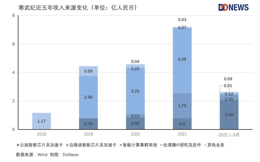 还有一部分来自“处于生命周期末期的云端产品销量减少”。寒武纪云端产品主要应用于互联网、金融等领域,主要客户包括服务器厂商、互联网公司,目前已经完成了第五代的研发工作,早期的智能芯片进入了生命周期末期。从2019年到2021年的营收情况来看,其销售不温不火,库存堆积也正常。