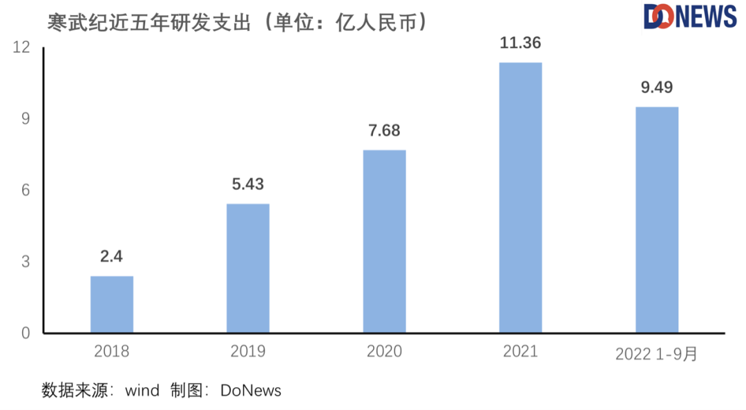 2022年,寒武纪扣除非经常性损益后的净利润预计亏损13亿到16亿元,最大的原因在于研发投入花了14亿到17亿元,较2021年同期增加23.6%到51%。