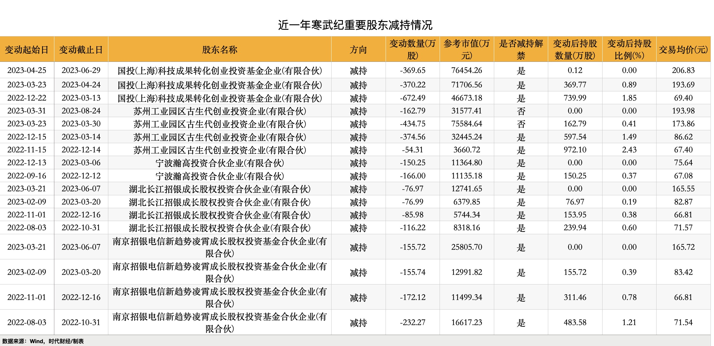 近一年寒武纪股东减持情况。数据来源:Wind,时代财经/制表