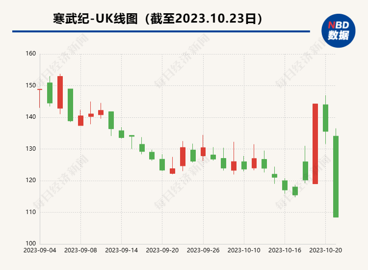 10月23日,寒武纪-U(688256.SH,股价108.44元,市值451.76亿元)股价由涨转跌,收盘跌20%,报108.4元/股。