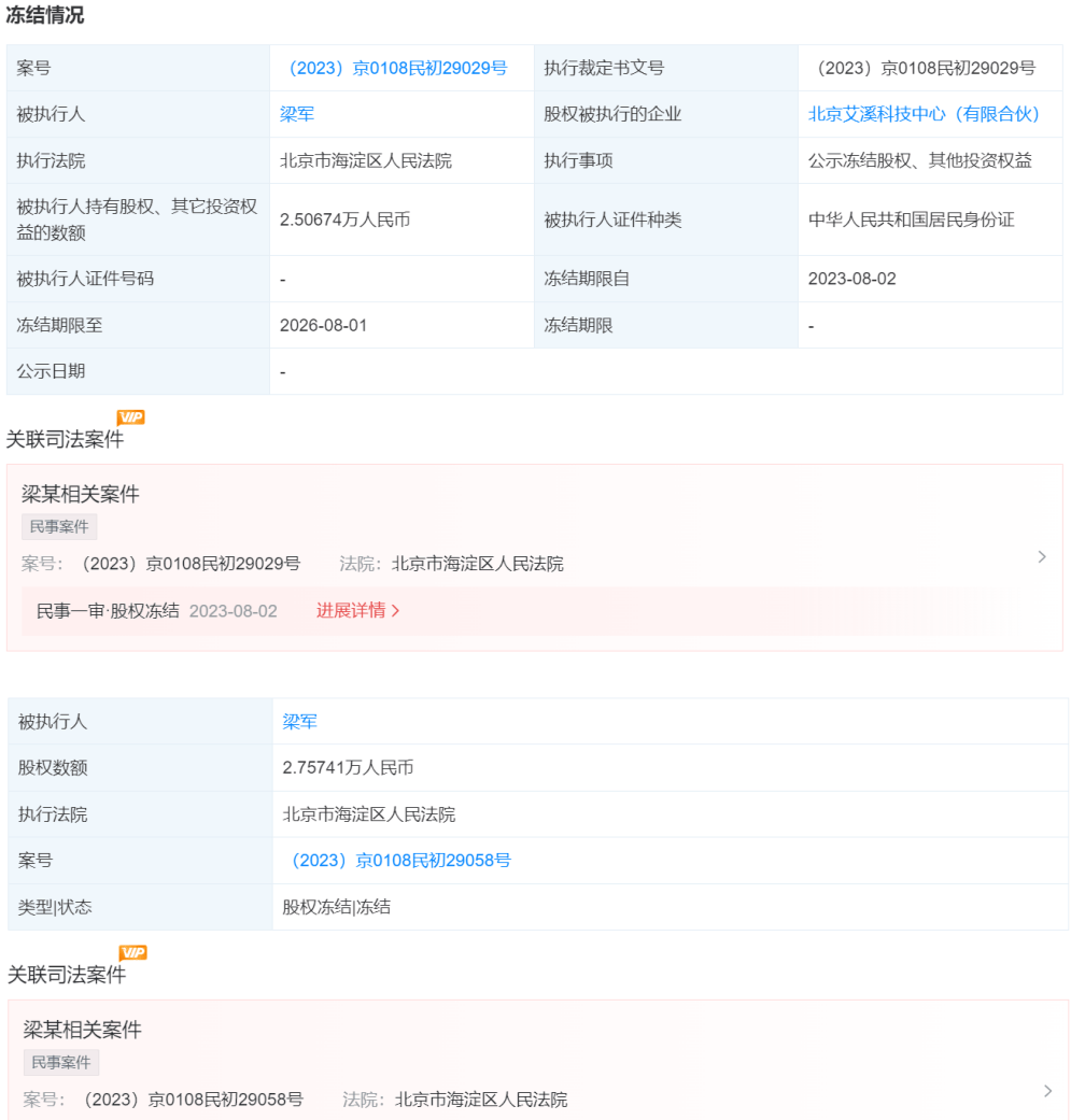 寒武纪有关方则可能更早向梁军发起了诉讼。搜狐科技注意到,梁军持有的艾溪科技和天津玄算股权,在去年8月已被司法冻结,对应案号正是梁军提到的在1月23日开庭审理的案件。