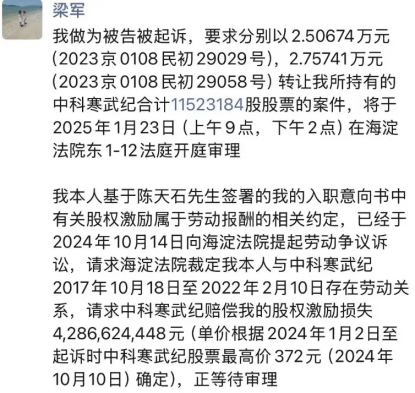 同时,梁军已在去年10月向海淀法院提起劳动争议诉讼,请求寒武纪赔偿股权激励损失近42.87亿元,该案正等待审理。