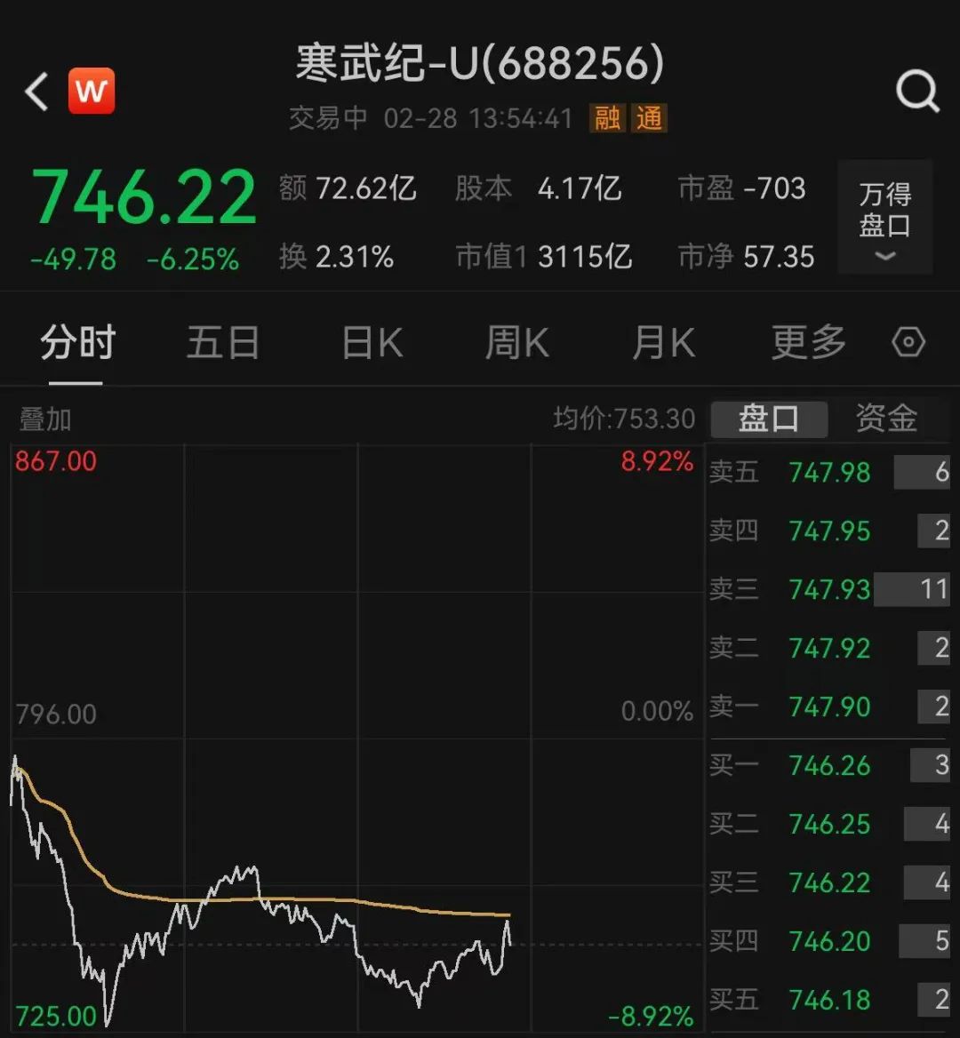 28日,寒武纪低开后震荡下跌,一度跌近9%,截至发稿仍跌超6%。