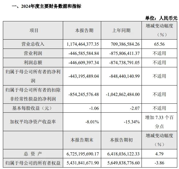 27日晚,寒武纪发布2024年度业绩快报。报告期内,公司营业总收入约11.74亿元,同比增长65.56%;归属于母公司所有者的净亏损(以下简称“归母净亏损”)约4.43亿元,上年同期约8.48亿元。