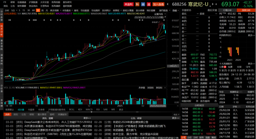 按道理说,业绩实现历史性扭亏为盈,加上Deepseek概念热火朝天,寒武纪在股价上应该继续高歌猛进才对,但现实情况却截然相反。