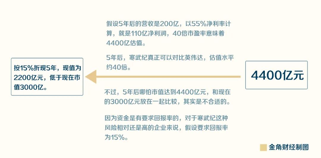 至于这个“大饼”有多大,肯定不是3000亿元。因为钱是有时间价值的,资本现在按3000亿估值投资,5年后还是3000亿,那图啥呢?所以,在讨论寒武纪目前市值时,不能简单地拿未来的市值直接对比,得先预估一下未来寒武纪的市值能去到什么水平,再通过一个要求回报率按年折现回来。考虑到寒武纪目前的实际情况,咱们假设这个折算的利率是15%。