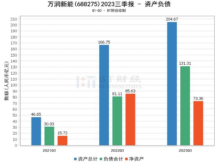 从资产负债方面来看,2023年三季度末,万润新能的总资产为204.67亿元,相比上年度末的198.59亿元,增长了3.06%。负债合计为131.31亿元,相比上年度末的111.36亿元有所增加。净资产为73.36亿元,相比上年度末的87.22亿元有所下降。资产负债率为64.15%,相比上年度末的56.08%有所上升。