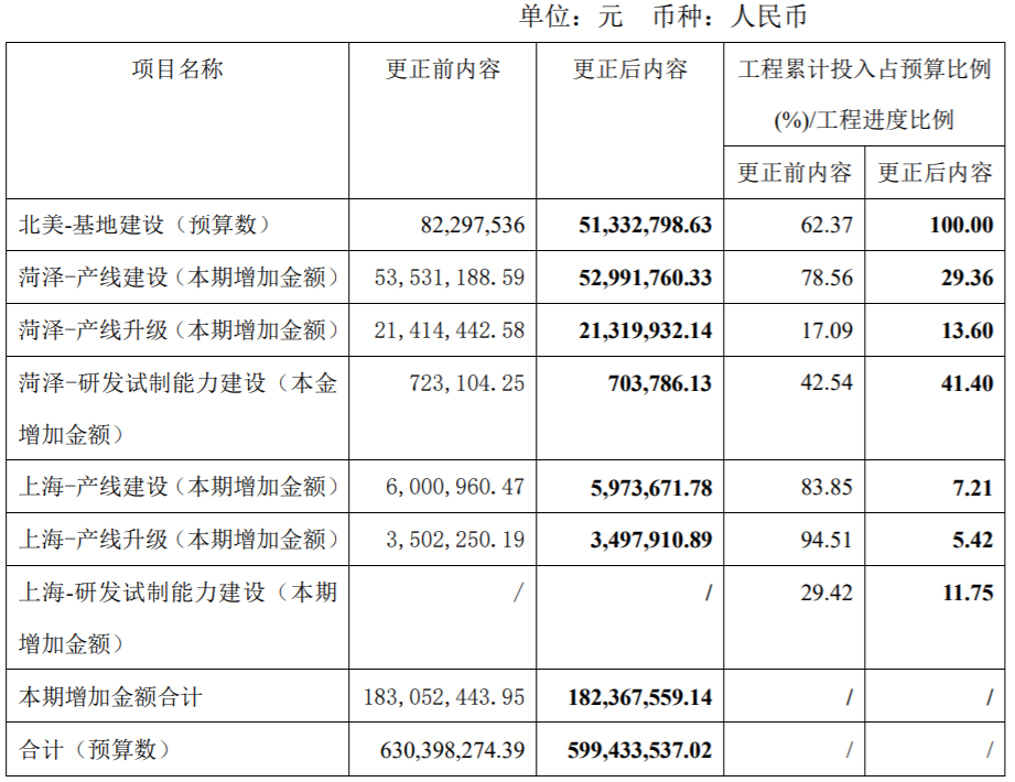 具体来看,精进电动针对应收款项融资、在建工程等多个财务科目信息进行了更正,其中变动最大的是对业务线情况的披露,例如在“第十节财务报告”之“七、合并财务报表项目注释”之“22、在建工程”之“(2)重要在建工程项目本期变动情况”中,将北美-基地建设(预算数)更正前由8229万元变更为5133万元、调减金额高达三千万元以上,进度比由62.37%更正为100%。