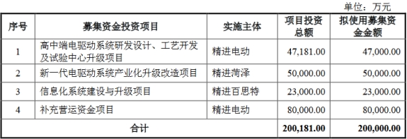 精进电动首次公开发行股票募集资金总额为20.33亿元,扣除发行费用后募集资金净额为18.55亿元。精进电动最终募集资金净额比原计划少1.45亿元。精进电动于2021年10月21日披露的招股说明书显示,该公司拟募集资金20.00亿元,拟分别用于高中端电驱动系统研发设计、工艺开发及试验中心升级项目、新一代电驱动系统产业化升级改造项目、信息化系统建设与升级项目和补充营运资金项目。